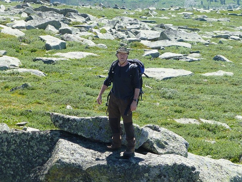 Alles aufgerödelt und eingepackt treten wir um 8:30 Uhr den langen Rückmarsch an. Mit Wehmut schaue ich zurück als wir den steilen Anstieg hinauf vom See hinter uns bringen. Sergej hat noch alles nach Spuren abgesucht und keinen Hinweis auf unseren Aufenthalt am Biwakplatz zurückgelassen. Nur die Feuerstelle ist noch da, aber mit Seewasser gelöscht. Wir gehen zurück zur Hütte, lassen alle übrigen Fertiggerichte da und specken damit unsere Ausrüstung auf das Nötigste ab. Heute Morgen habe ich zum Frühstück mit Widerwillen noch ein Fertiggericht mit Nudeln hineingewürgt. Gott sei Dank nicht mehr herausgewürgt! Ich kann das Zeug nicht mehr sehen und riechen, aber es hilft nichts. Ich brauche Energie für den beschwerlichen Abstieg. Viel Energie...