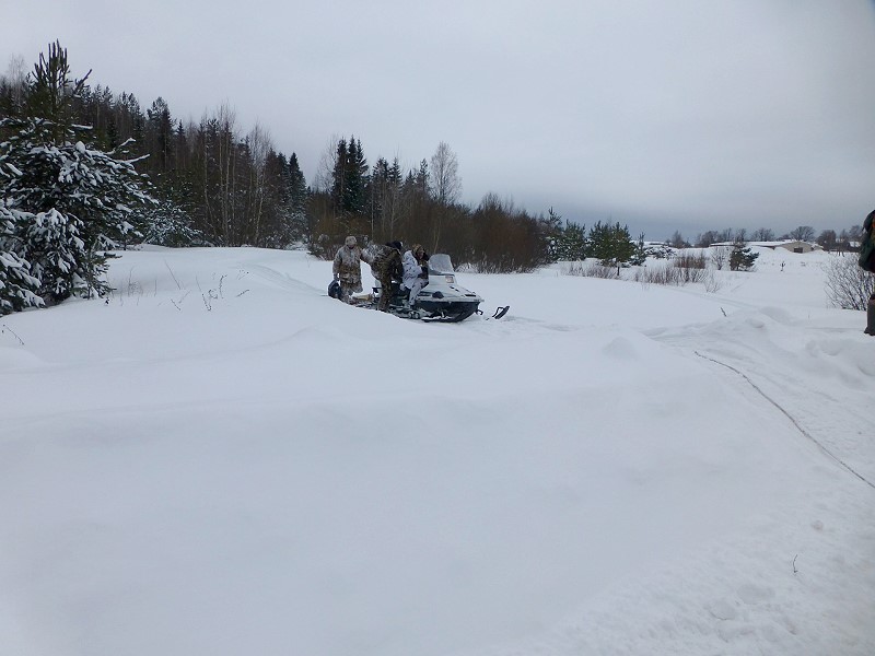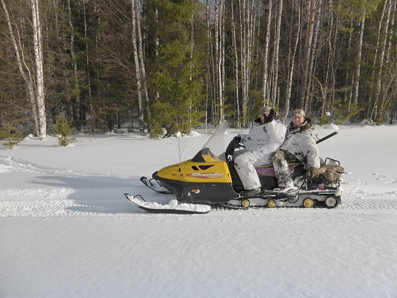 Noch ehe es dämmert, steht Sergej mit einem Schneemobil vor der Jagdhütte. Schnell ist eine Decke organisiert und Wladimir leiht mir eine Kugellaufwaffe, einen Repetierer mit aufgesetztem Nachtzielgerät und los geht’s. Der deutsche Sergey will auch mit und setzt sich hinten auf den Anhänger. Na das kennen wir. Die nach hinten raus geblasenen Abgase und das aufgewirbelte Schneegestöber vom Antrieb des Motorschlittens sind nicht angenehm!