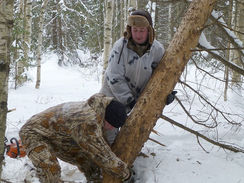 Aber nach fünf Spiegeleiern zum Frühstück geht’s wieder. Auf der Busfahrt zu den Schneemobilen im Wald hört Sergey heraus, dass die Jäger gerne sehen möchten, wie sicher ich mit ihrer Flinte umgehen kann. Naja, wundern tut’s mich nicht. Am Biwak Platz suchen wir gemeinsam ein etwa 50 Meter entferntes Ziel, weit oben in einer großen Astgabel, eine Schneefläche so groß wie ein Blatt Papier. Ich lade eine Brenneke und 'Peng', der erste Schuss geht mitten durch das anvisierte Ziel. Das müsste reichen, aber da kramt Wladimir noch etliche 12/70 Schrotmunition für die Vogeljagd aus seinen Hosentaschen.