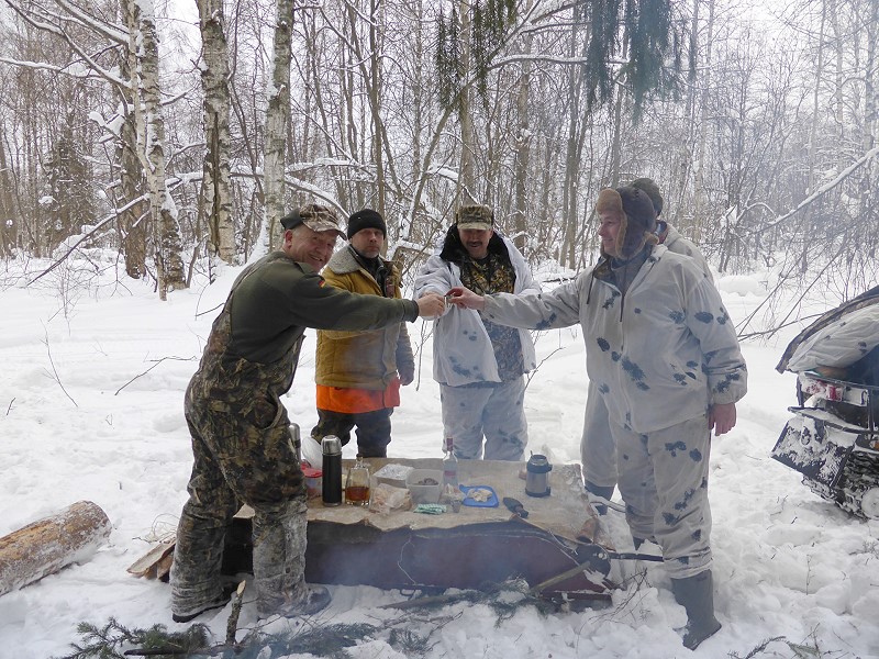 Für heute geht’s wieder heim. Diesmal werden die beiden Schneemobile im Wald versteckt. Die Waffen, die Ausrüstung und natürlich auch der erlegte Wolf werden im Uaz Bus verladen und bevor die Nacht hereinbricht sitzen wir bei leckerer Hühnerfleischsuppe, selbstgemachten Tortellinos mit einem Hack aus Keiler- und Elchfleisch gefüllt, runden das üppige Mahl ab.