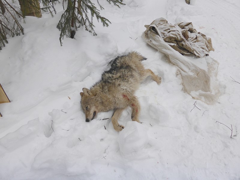 Der Wolf macht einen gewaltigen Satz nach vorne über die Lappleine und ich sehe ihn nicht mehr. Ich denke schon, viel zu weit weg, den hast gefehlt. Nach etwa 5 Minuten gehe ich, vielmehr breche ich durch den hohen Schnee in Richtung Anschuss. Als ich auf zwanzig Meter herankomme traue ich meinen Augen nicht. Etwa 10 Meter hinter der Lappleine liegt mein Wolf, offensichtlich tot, im Wald. Ich drehe mich um und deute Wladimir mit der rechten Hand eine flache Linie vor meinen Hals zeichnend, dass der letzte Wolf in diesem eingelappten Wäldchen seines großen Jagdgebiets tot ist.